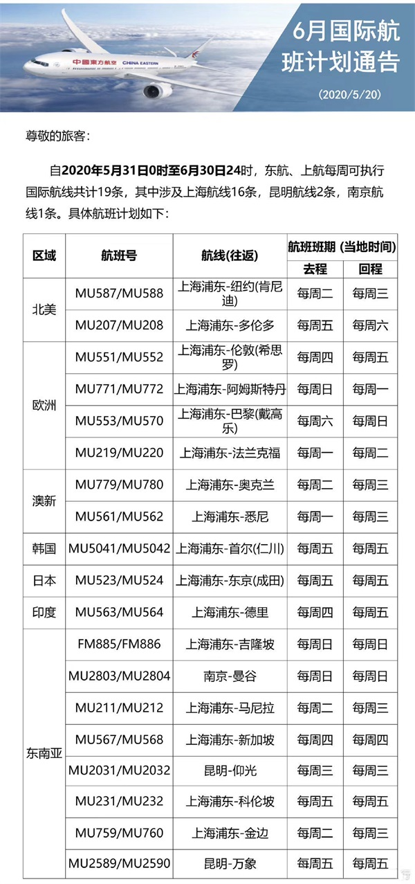东方航空也已经出台了六月份的航班计划,基本上保持着原来的“五个一政策”内的航班,